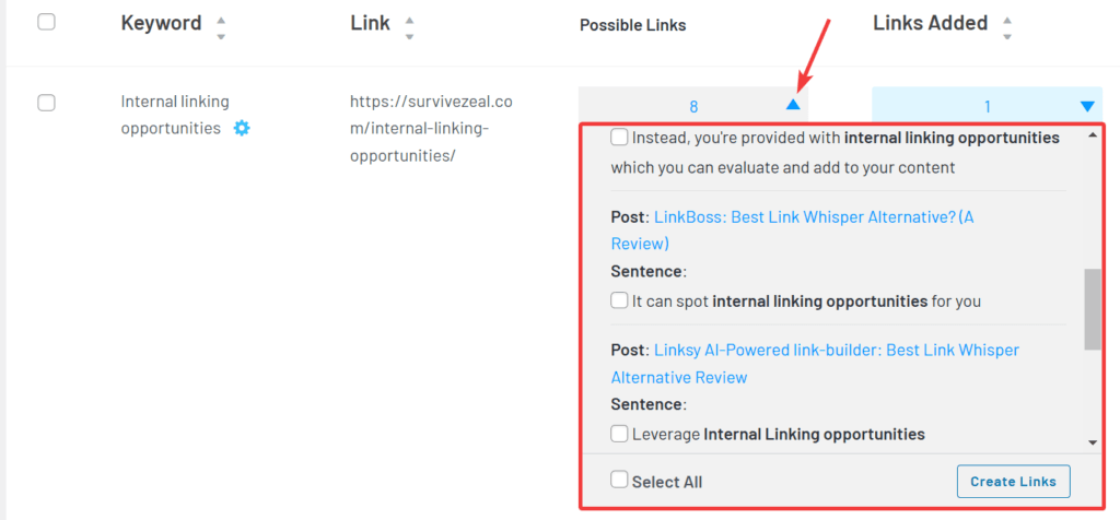 Once you’ve identified a page that needs a helping hand, simply click the Add Links button. Link Whisper will analyze your content and provide suggested internal linking opportunities. The tool uses its AI to find anchor phrases within other pages on your site that match the target page.